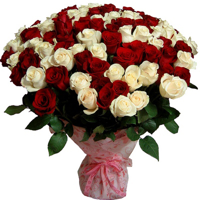 Огромный букет из 101 Эквадорской Розы высотой 70см. В букете красные и белые розы вперемешку.