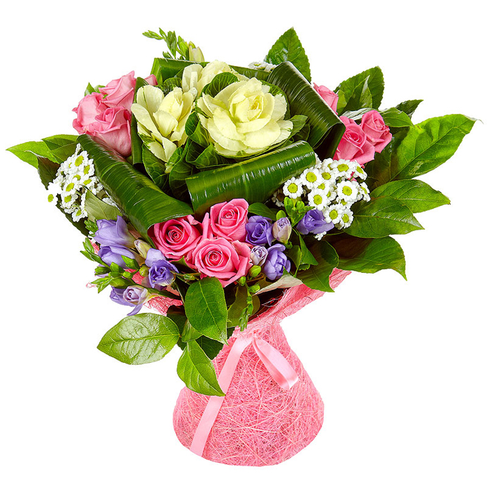 Букет из роз, ромашек, эустомы и Брасики (декоративной капусты). Очень оригинальный букет, яркий и притягивающий взгляды.
