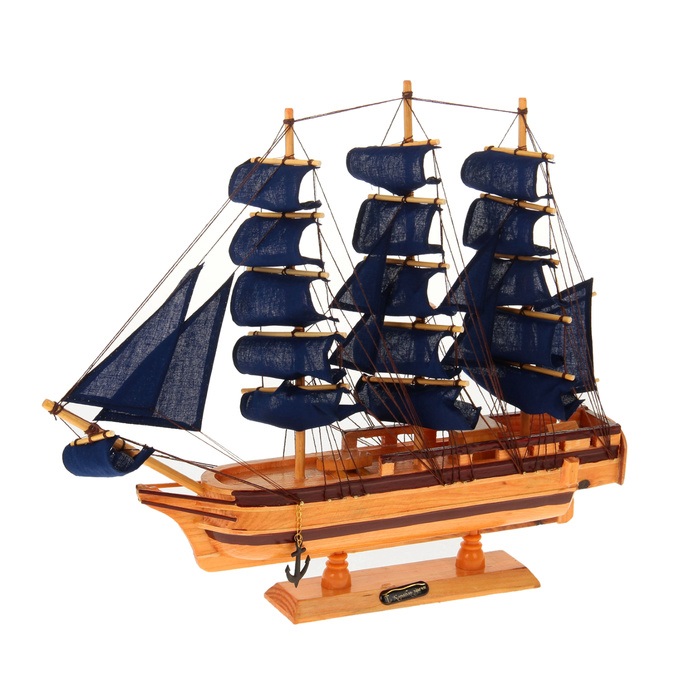 Корабль среднего размера, сувенирный. Борта из красного дерева, с коричневой полосой, 3 мачты, синие паруса. Отличный мужской подарок для все возрастов и увлечений.