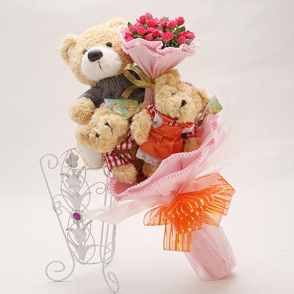 Букет Цветы для любимой состоит из 1 большого мишки и 2 маленьких мишек. Большой Медведь держит великолепный букет из роз. Букет оформлен розовым упаковочным материалом.